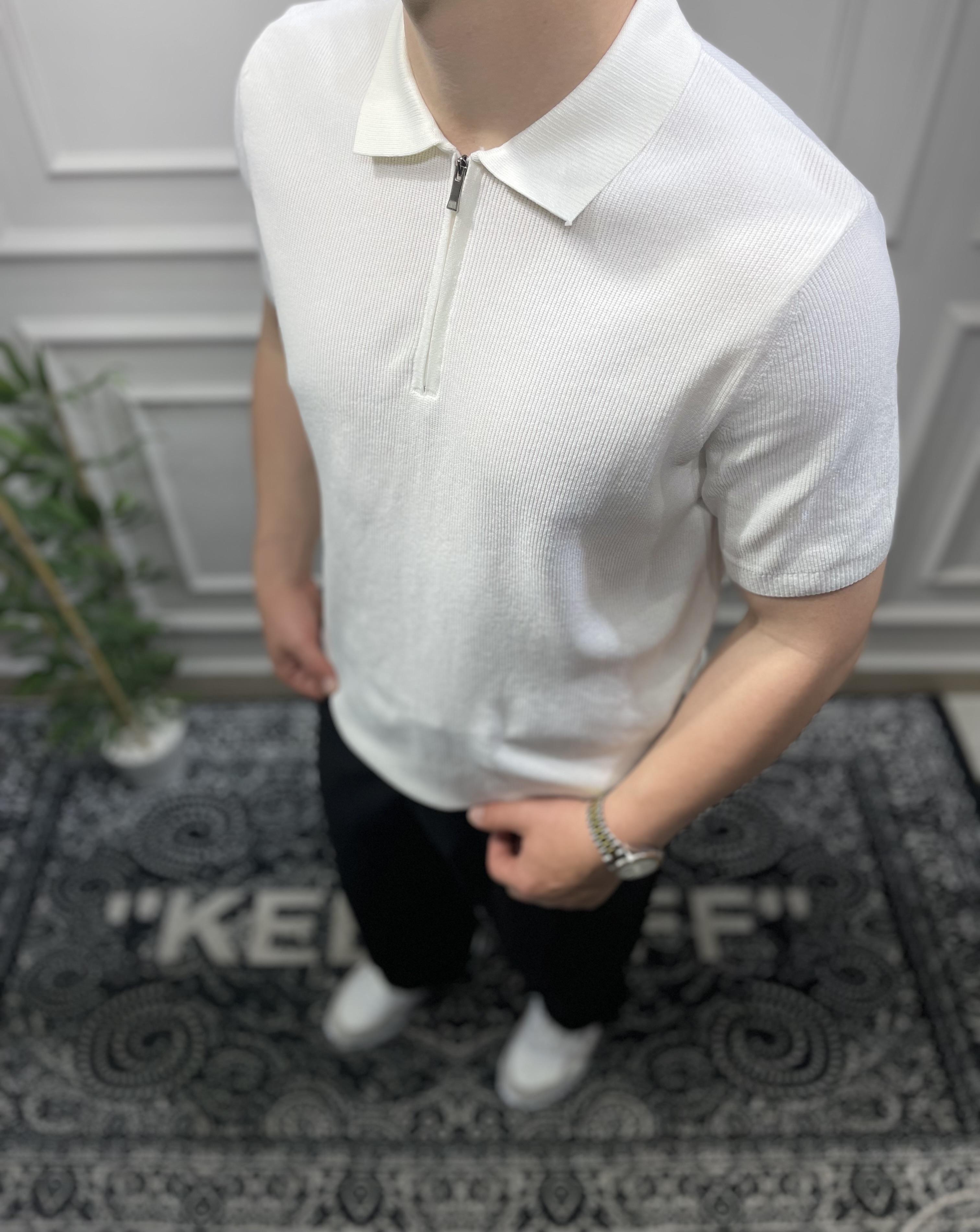 Fermuarlı Polo Yaka Triko - Beyaz